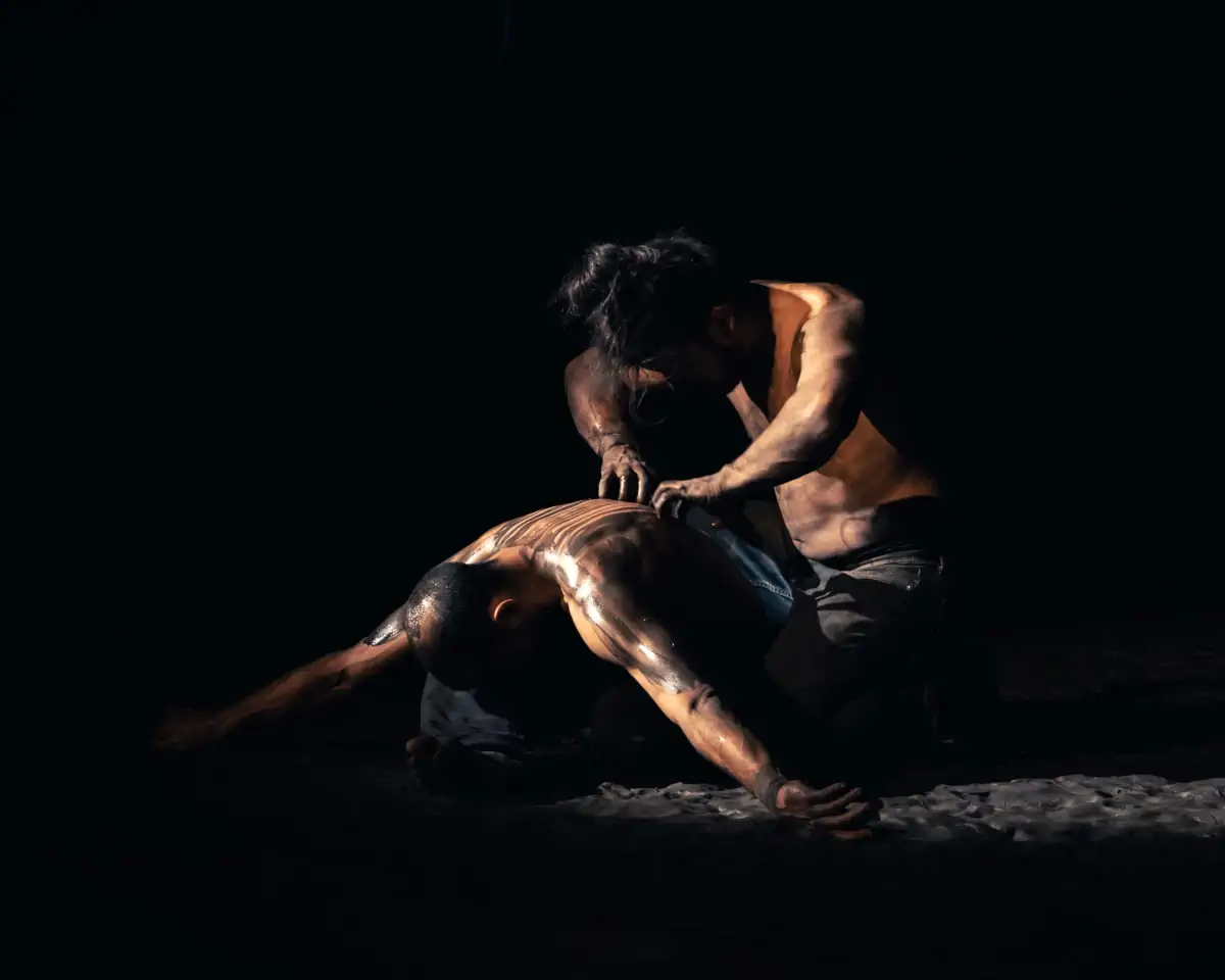 Avec des artistes nomades venus du Canada, du Chili et de France, Huellas nous donne à voir la virtuosité de l’acrobatie accompagnée par une musique intemporelle impressionnante. Sur un tapis d’argile noire monumental, qui est une matière pour rebondir, sauter et s’amuser, nous sommes plongés dans un monde d’images, tour à tour drôles ou poétiques, de jeux de lumières qui dessinent les lignes saillantes des corps en mouvement. Huellas est un voyage intérieur, à travers le temps et l’espace, où l’acrobatie et la danse s’épousent avec une force, une tendresse et une précision brute.